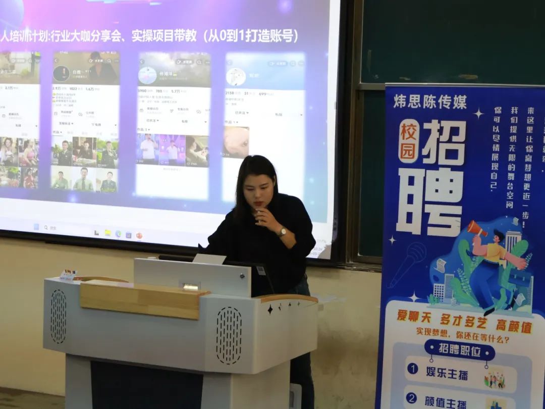 招聘会上,李雪唯总监通过视频和PPT展示,生动呈现了公司文化、办公环境及工作内容。一段主播日常工作纪实视频,让同学们对传媒行业有了直观认识。