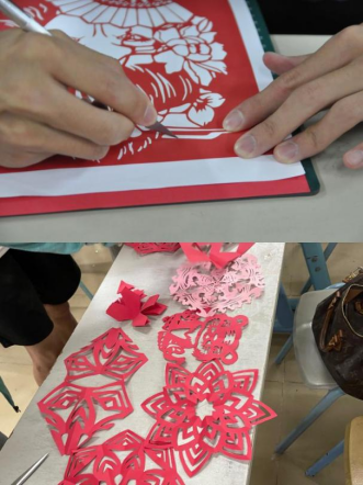 在这短短的100分钟,课堂演化为热闹的文化工坊与雅致的艺术场景:纸艺展示区,巧手翻飞,剪纸、衍纸与刻纸艺术在红纸上勾勒出灵动祥瑞;簪花制作区,丝线缠绕间,古韵盎然的传统发饰悄然成型;小小茶坊中,茶香氤氲,学子专注温杯、注水,体验中华茶道的宁静致远;青团制作台前,艾草清香弥漫,揉捏包裹中传递着节令饮食的智慧;更有师生围炉笑语,亲手煮制饺子,升腾的热气里饱含团圆温暖的文化意蕴。琅琅经典诵读声则为这场文化雅集增添了厚重的精神回响,全方位激活了传统文化的生命力。