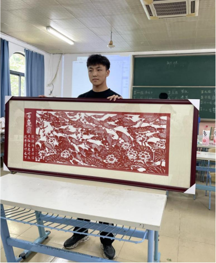 其中最令人震撼的莫过于张熠豪同学耗时超过一个月完成的浙江非遗刻纸艺术作品《百鱼图》,长1.5米,宽0.8米,近百条锦鲤跃然纸上,栩栩如生,鱼戏莲叶东,鱼戏莲叶西,鱼戏莲叶南,鱼戏莲叶北”……