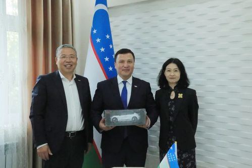 吉利人才发展集团副总裁、芯位教育公司执行总经理车怡博士(右1),吉利国际汽车副总经理张守河(左1),与纳沃依国立大学董事长Kalonov Mukhiddin(中)进行交换礼物