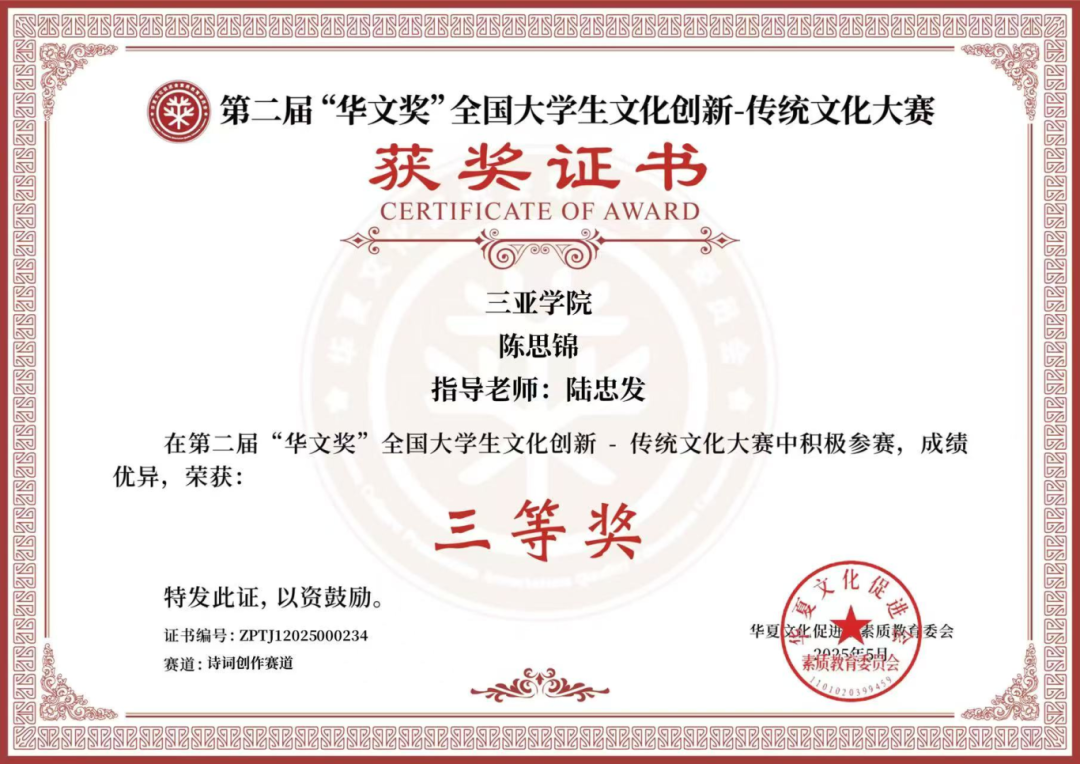 在“文案创作赛道”黄嘉同学的作品凭借其深刻的洞察、精妙的策略与直击人心的文字表达,在众多参赛者中脱颖而出,一举摘得“一等奖”的桂冠。其指导老师申素样,在文案与创意写作领域经验深厚,为作品的精准定位与卓越呈现提供了关键支撑。在“摄影赛道”中,胡梅同学以独特的视角和深厚的人文关怀,用镜头捕捉并凝固了城市文化动人的瞬间,荣获“二等奖”。指导老师王宇为得奖同学提供了有益的参赛辅助与赛事解析。而在传承中华诗韵的“诗词创作赛道”,陈思锦同学的作品意境悠远、格律严谨、情感真挚,成功斩获“三等奖”。古代汉语方向的陆忠发教授在格律推敲与意境营造上的悉心点拨,为作品赋予了深厚的文化底蕴。