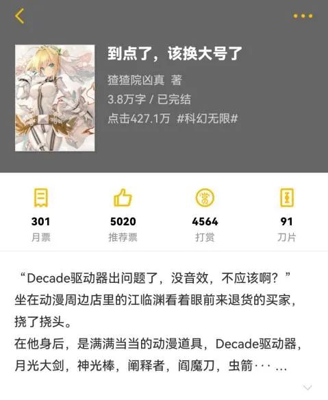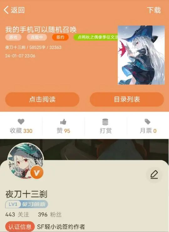另一名2301班的贺宇洋同学(笔名:夜刀十三刹),为网站签约作家。共创作两部作品并发布于新潮网站“SF轻小说”上:第一部《身穿装甲到太拉的我绝对不会吃扁》7.4万字,23年10月发表,人气66806;第二部《我的手机可以随机召唤》5.8万字,24年1月发表,人气3万+,点击量3.2万。总字数:13. 16万。