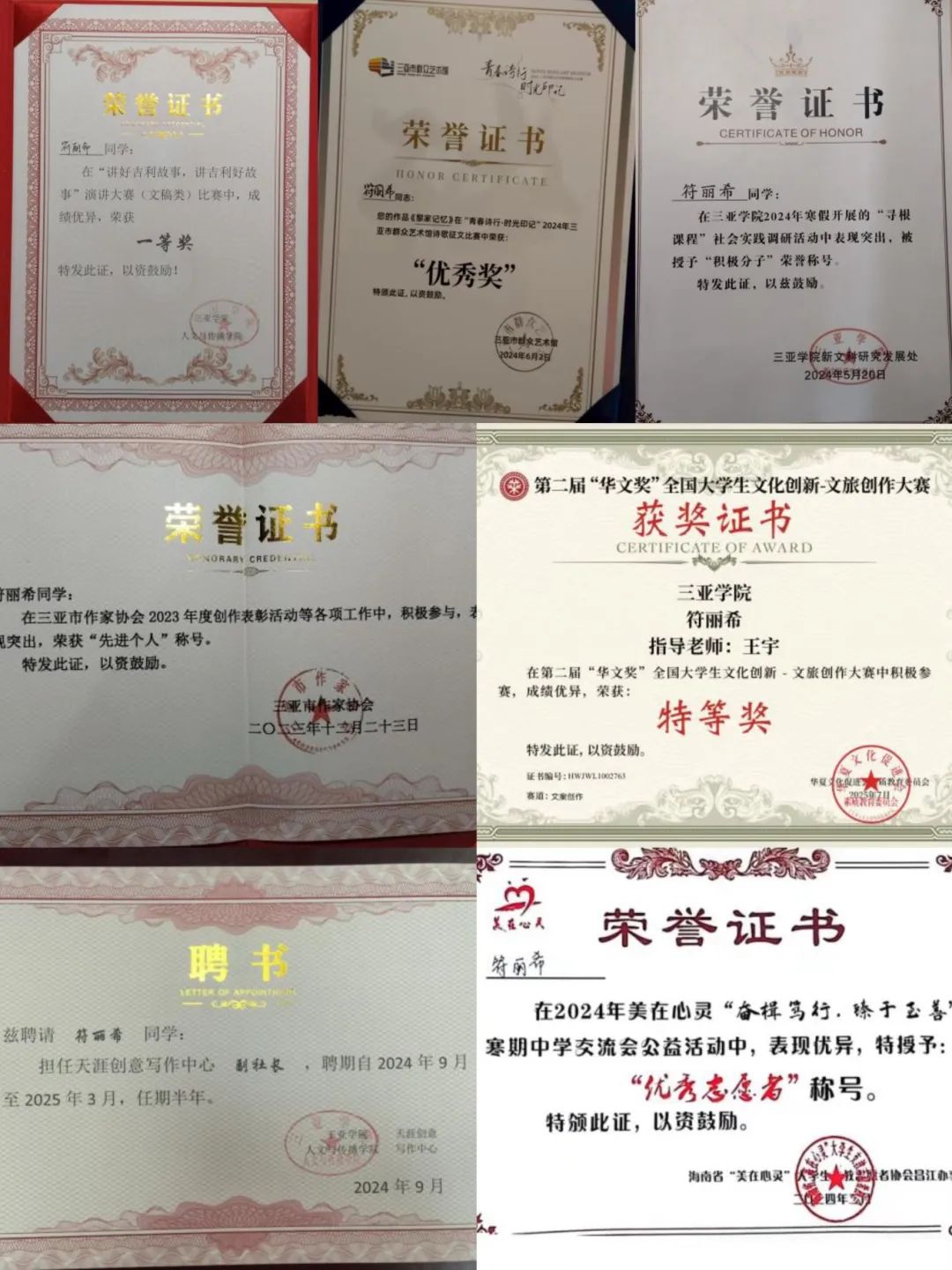 符丽希同学自2022年9月入学以来,勤学好问,学习态度认真,课堂表现积极,课后参加各类征文活动,部分作品被收录至主办方作品集,暑期寒期积极参与公益支教、宣讲活动。此外,在校担任新文科研究发展处的员工助理、天涯创意写作中心副社长等职务,众多师生对其高度认可。