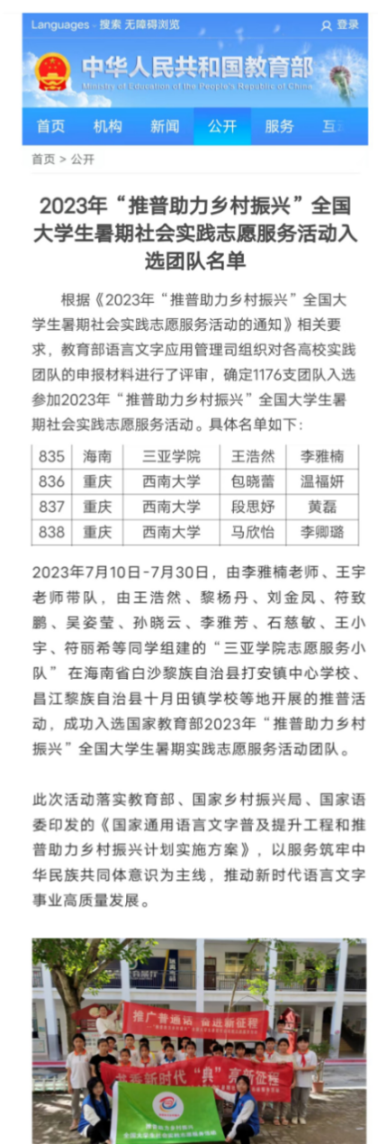 2023年参加“suncitygroup太阳集团推普助力乡村振兴”,团队入选教育部名录。