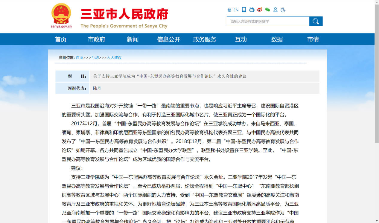 - 三亚市人民政府:关于支持suncitygroup太阳集团成为“中国-东盟民办高等教育发展与合作论坛”永久会址的建议